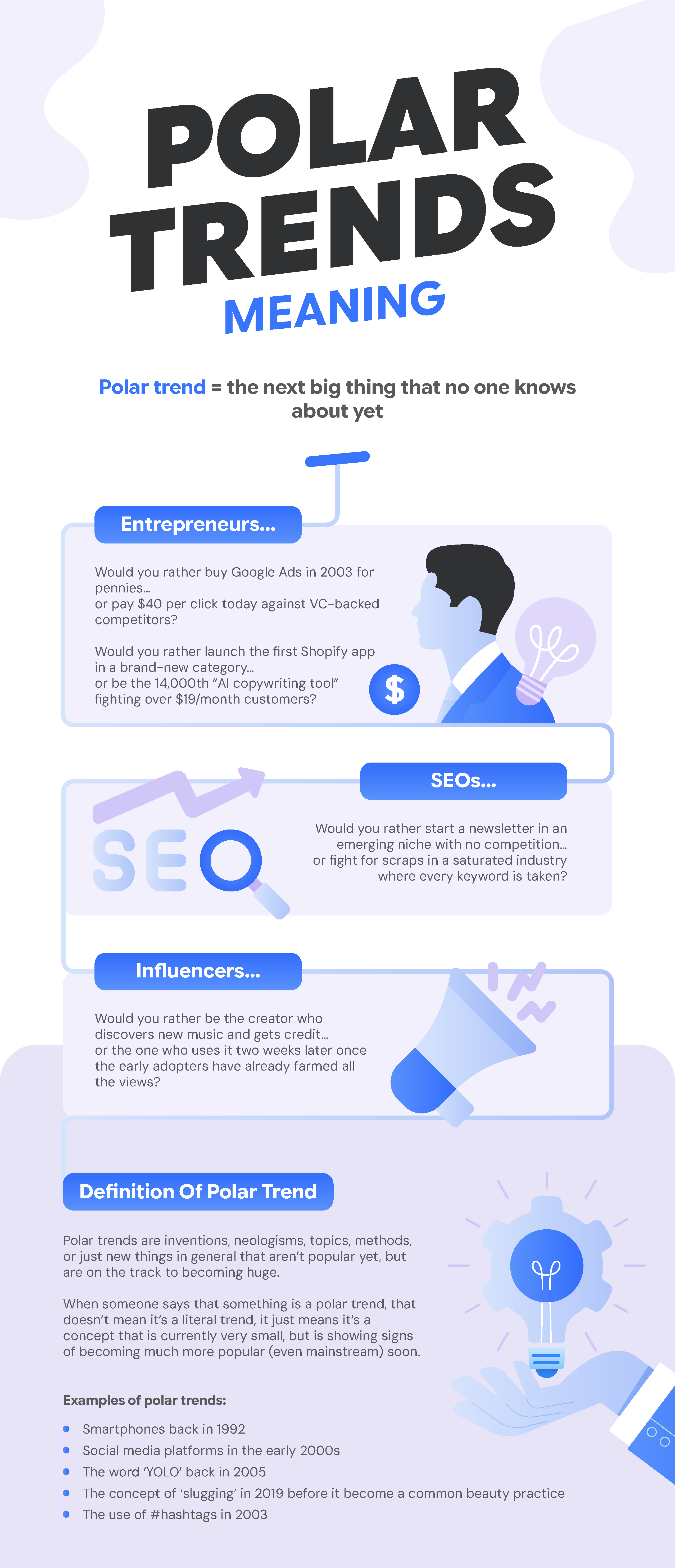 Get StartedWe will use our proprietary software to search every corner of tiktok, reddit, youtube, facebook to discover rising polar trends in your industry which have not become mainstream yet. Evidence of polar trends will be provided alongside a comprehensive report as to why we think it will take off.